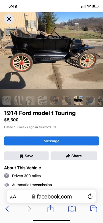 According to today's classifieds, this car is already sold.J Sundstrom wrote: ↑Thu Apr 14, 2022 7:48 pmSaw this on Facebook Marketplace. 1914 Touring for sale in Indiana. Has all the bows and windshield components, brackets etc. It would be a project to complete but from pictures it looks mostly there. Is it worth $8,500? I have no idea just passing this along and have nothing to do with whomever is selling this car.