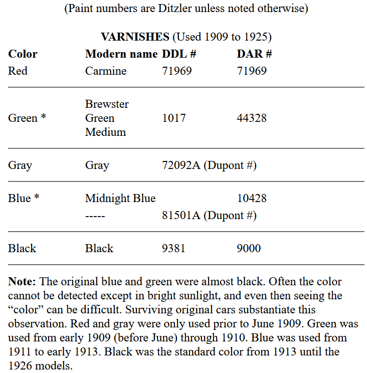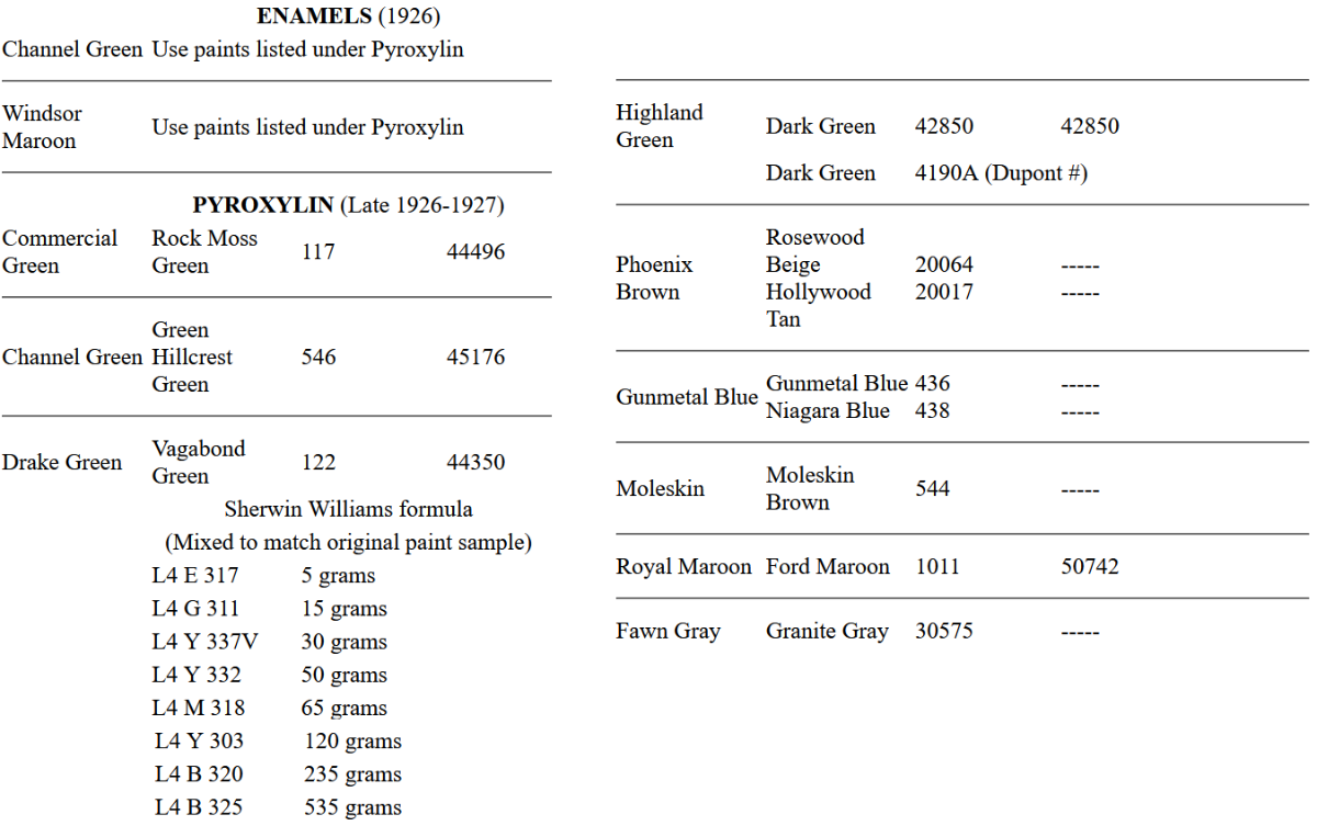 Paint colors from the the MTFCA Encyclopedia http://www.mtfca.com/encyclo/P-R.htm#paint1