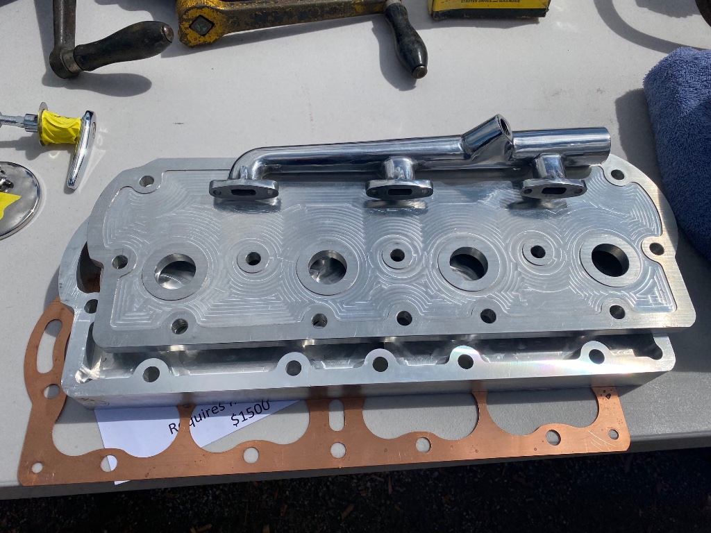 CNC head was said to provide 7-1/2:1 compression ratio, included solid copper head gasket and required an electric water pump, buyer to drill for water outlet manifold.