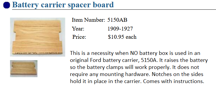 When I bought my '27, the battery carrier and spacer(s) were a mess. I kid you not - I found Duct tape, Baling wire, and a couple of sheet rock screws (one of which protruded about 1 1/4" below the carrier). I repaired the battery carrier and thought about making my own spacer. When I looked at the Lang's catalog and saw the price of a store-bought spacer, I was on the phone to Lang's within ten minutes. No way I could get a decent piece of wood and make the thing for the $10.25 that Lang's wants for it. I also bought it a buncha years ago and it was cheaper then that.