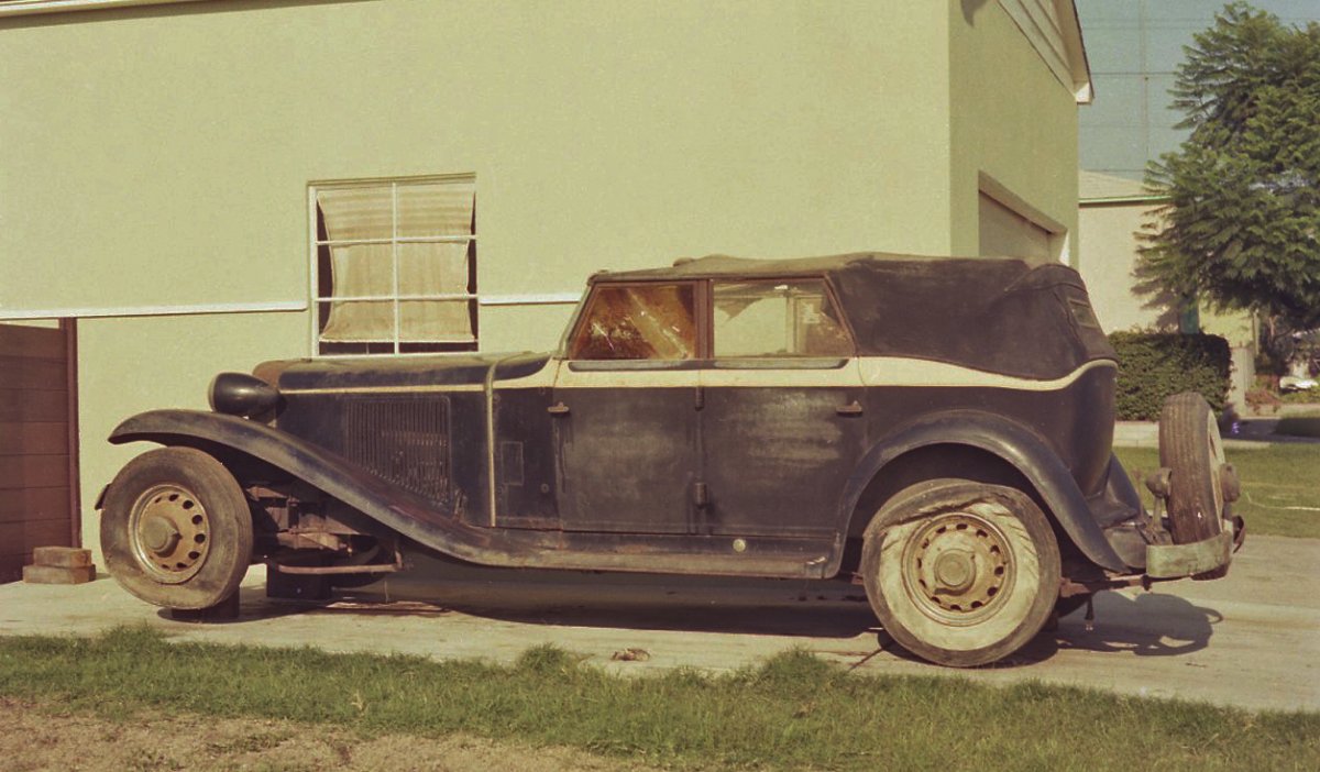 In 1977 I discovered this in a garage in San Diego. It had been there since the end of World War II. It is a 1930 Cord L 29 convertible sedan, the 9th one known to exist at the time.