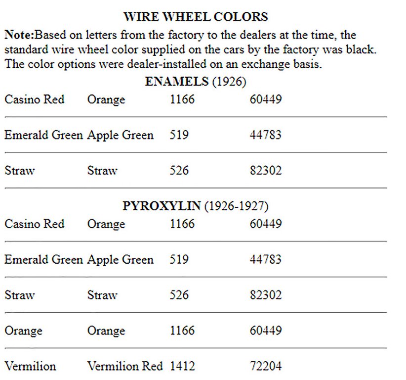 In the MTFCA Forum search box, do a search for “wire wheel color code”. A lot of threads for 5his Model color will come up from which you can select the one that is the most helpful. Jim Patrick