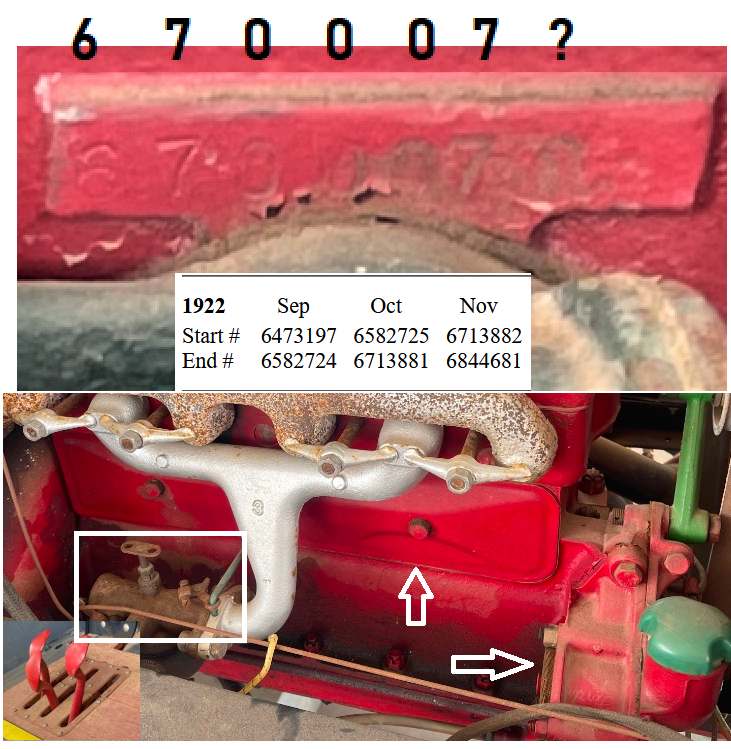 Can anyone read this engine number? I tried looking it up but I don’t think I’m reading it right. In person it’s even harder to read so I took this pic but still can’t make it out. May try to use some chalk or something tomorrow I’m just curious. Looks like 6700070 or 67000770…but that doesn’t make sense to me if it has another 7 in there. If the first number is right that’s a 1922 motor on a 1925 frame/body? Unless it was in the rogue highland transition?