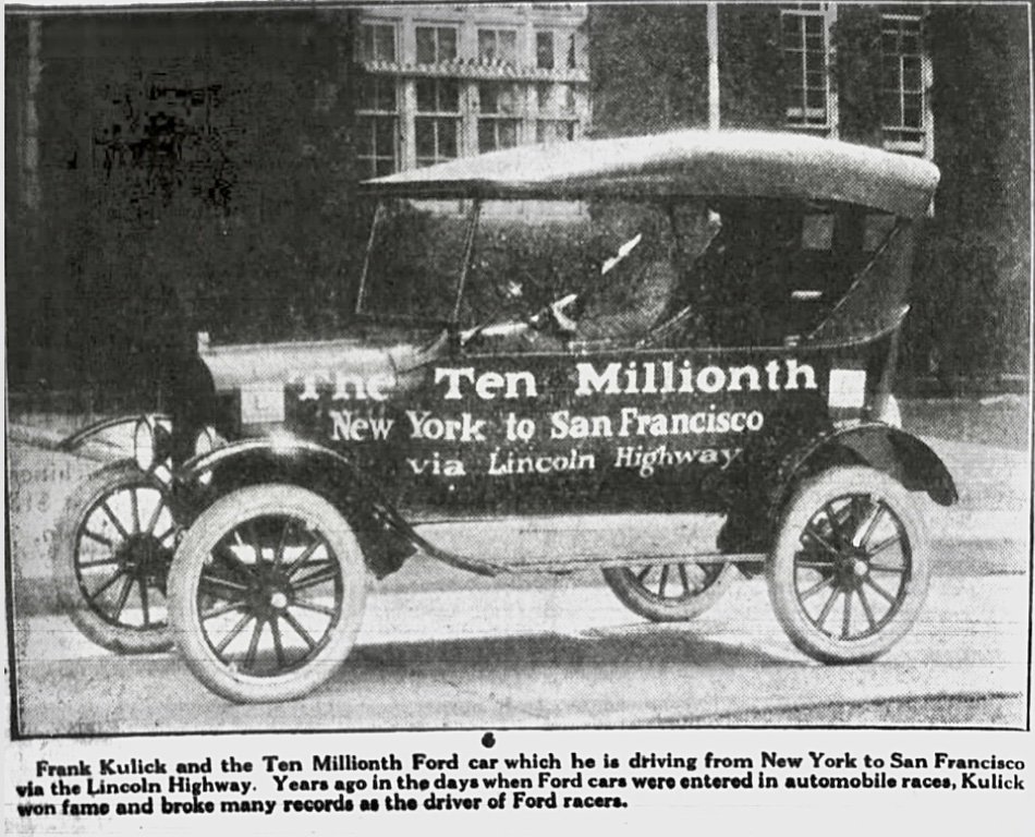 Frank Kulick, one of Ford's first employees and famed race car driver was selected to drive the 10 millionth "T" across the country (as mentioned before). A few pics I included in a "Kulick" article earlier this spring. Frank and wife Mary Kulick drove the car across the country, following the route of the Lincoln Highway, stopping along the way for parades and celebrations. Below are a few pics, courtesy of "The Henry Ford," all rights apply:
