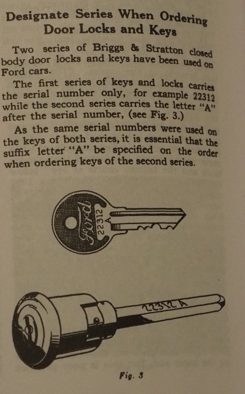 Lang’s has a good reproduction door lock and keys for the 24-27 closed car for around 15.00. https://cdn.modeltford.com/i/c/475408l.jpg.