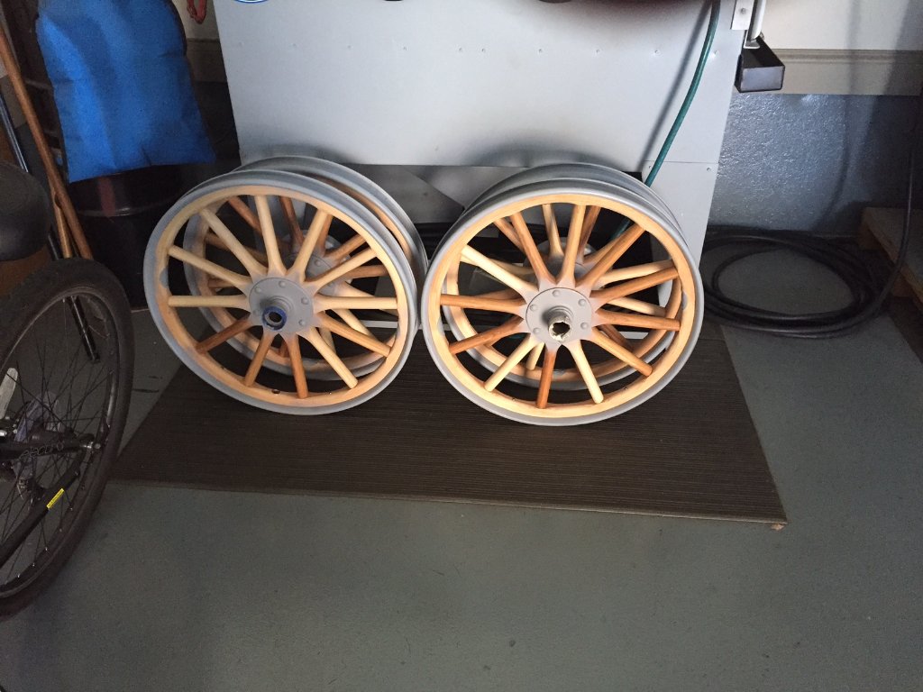I had my '12 wheels replaced by George many years ago and the wheels looked super but after several years of driving with the front wheels out of round causing a vibration a slower speeds I finally decided that I was going to fix them or have them replaced. I was able to true up the wheels after removing and taking a cut on the mill of the outer felloe to get it into a perfect circle. We glued a thin wood shim to the newly cut felloes and then cut the finished wheel to a correct size that we could press into the steel rim. Now the wheels run smooth at all speeds. No more slow speed shaking and the tires stay on the surface at highway speeds as well!
