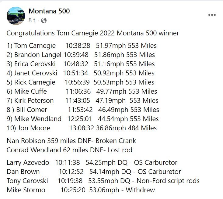 Congratulations Tom on your win and thanks for the information . . . interesting results. Dennis Powers was a 40+ year friend of mine and I've known Dan Brown for some time too. I've always enjoy following the Montana 500 since I first found out about it in 1972 from a Minnesota contestant. Sounds like lots of issues this year declaring a winner. That sure must have been one hell of a drive with that kind of wind!!