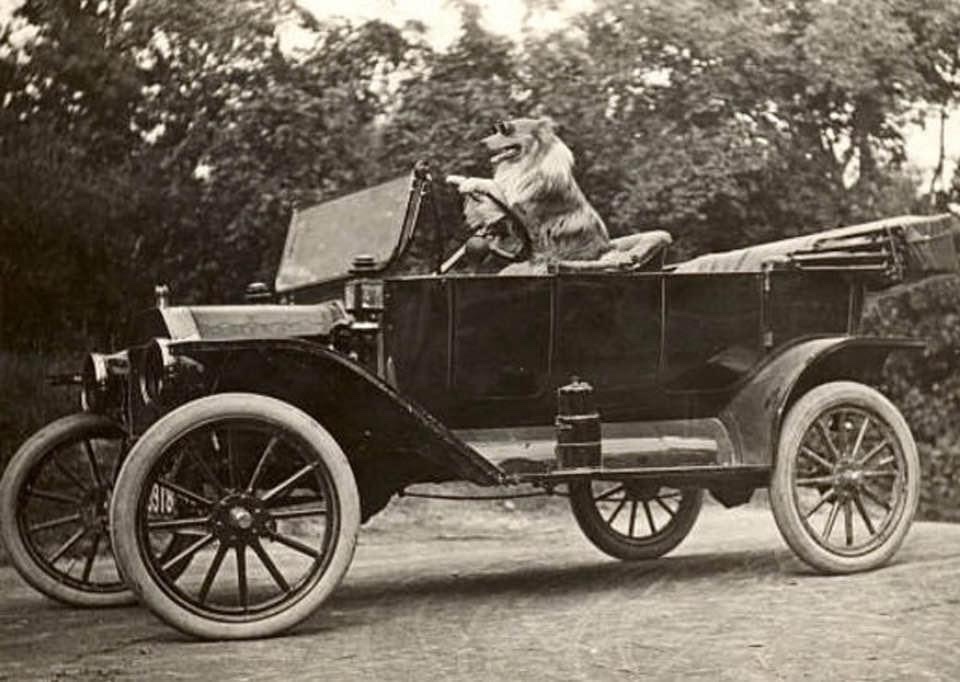 The car in the photo underneath "the dogs" is interesting. It appears to have even fold hinges, used 1915/'16 and early 1917s, however with the frame mounted by bolts in from the side, not riveted like most even fold windshields. That should make it an early to mid 1917. The hood appears proper for a 1917, however, that rear fender appears to be a flat curve as used in 1915 and 1916, not the crowned curve that began showing up very late in 1916?