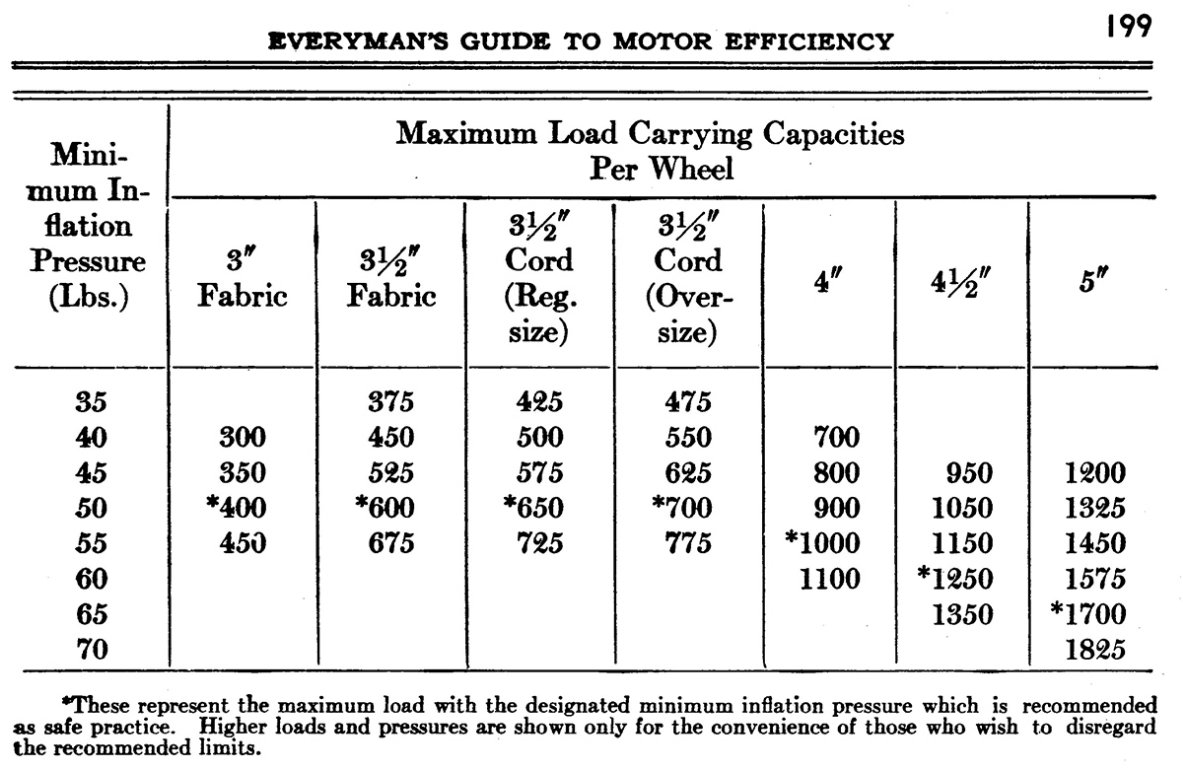 This chart doesnt mention clincher or non clincher. The higher pressure keeps the tire in the clincher rim. Remember also, back then clincher beads even overlapped in the middle. Todays tires do not. There is a high risk of the tire coming out of the clinch. Along comes balloon tires. Air pressure was determined by load, not a standard 32psi. Charts show much lower pressures.