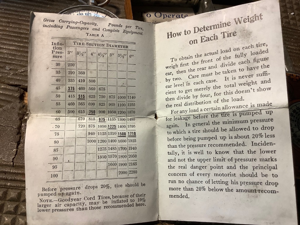 This is from Floyd Clymer's reprint of a Tire and Rim Book. (1915 to 1927) While the new tires are better in many ways than those made in the teens and twenties it serves as a guideline. Note that it says "minimum" inflation. I have been running 40 in the front and 45 in the rear with good luck. I can see more may be better.