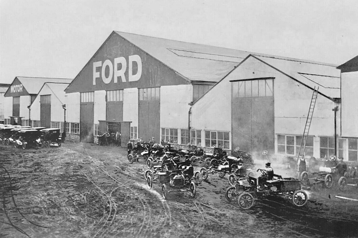 The FORD factory is the SE corner of the Trafford Park, Manchester factory where Fords were built from 1911 to 1930. As you can see from the doors, it was a former tram depot.