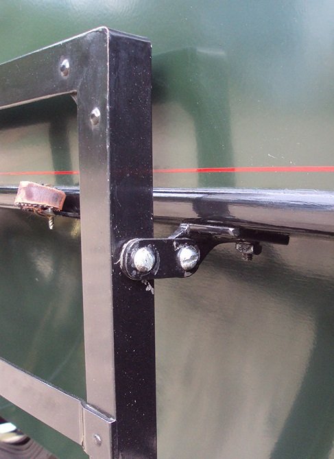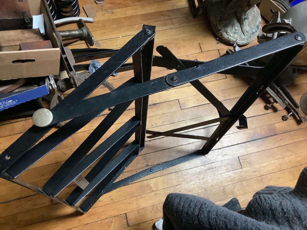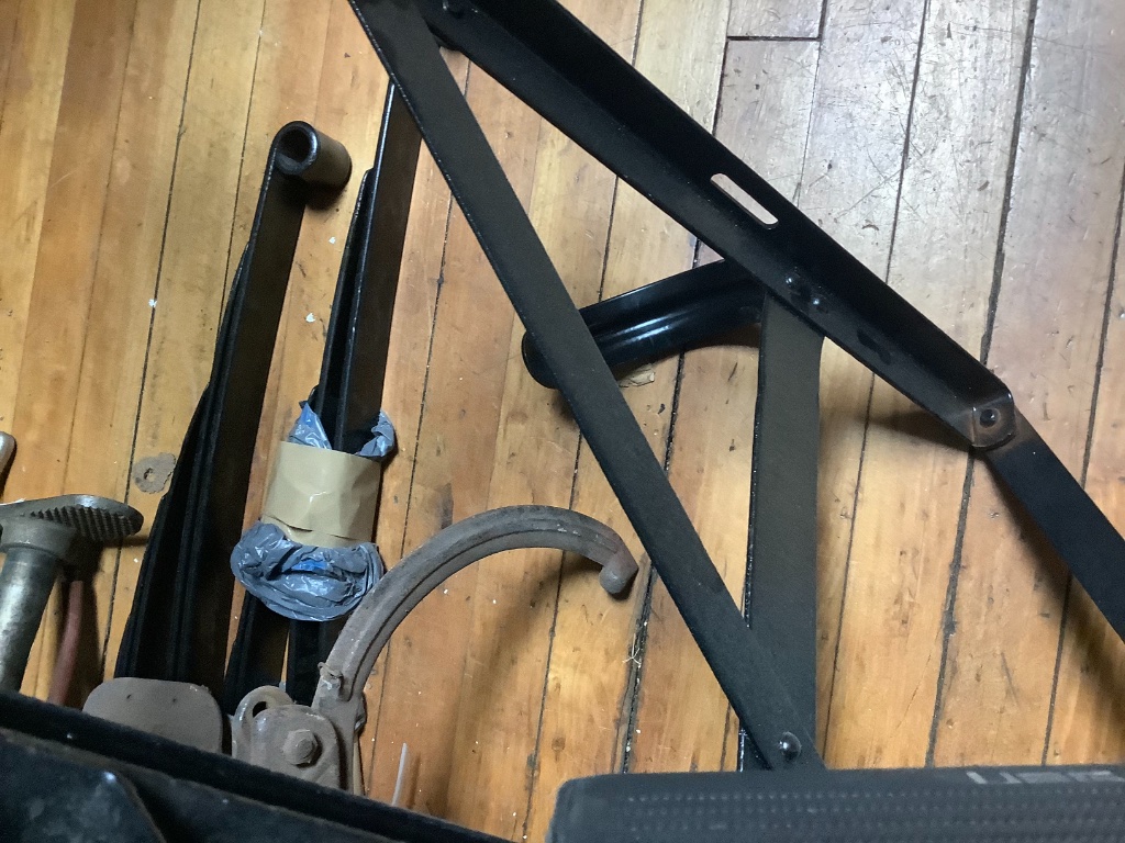 This one is very light, even being steel. Aluminum stock would be even better. I changed the hole to match the angle of my rear spare. Also has an oilcloth covered pasteboard trunk that’s held on with leather straps. Note the latch, the drop arms and also the slots for the leather straps. I’d say a junior high level metal shop project ( if they still had such a thing!) let me know if you want it Tim, and it’ll be on the way.