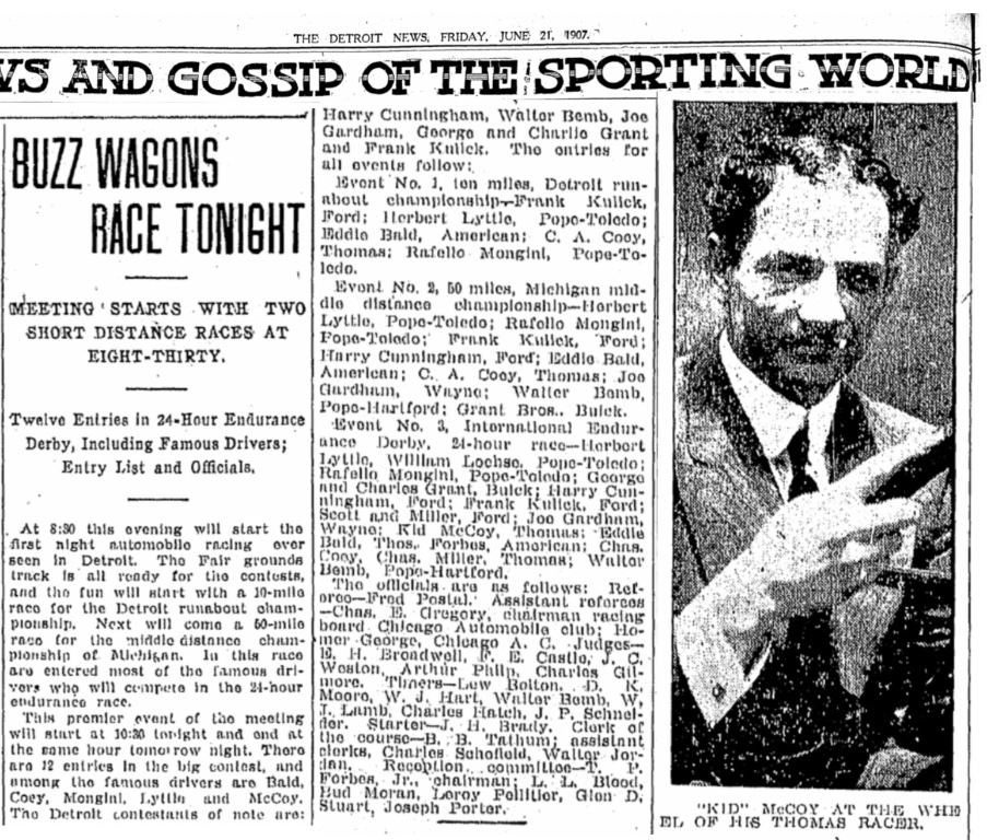 Several of the best drivers in the world entered, and were featured in advertising. Eddie Bald would years later be listed as the best driver of 1907. Herbert Lytle was a Vanderbilt Cup participant, and widely followed across the U.S.. Mongini was a famous Italian driver, who would later in 1907 win a 24 hour race himself. Kid McCoy was a well known former prize fighter. He would later become a Ford Agent in Pittsburg, and Charles Coey was a well known Thomas Flyer agent from Chicago, who would go on to produce the Coey Special, his own creation using a Thomas chassis. Cory also won a 24 hour race later the same summer.