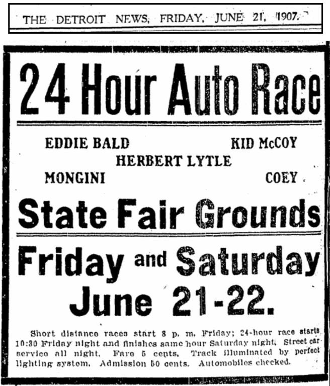On June 21, 1907, Ford Motor Company entered three cars in a 24 hour race at the Michigan State Fairgrounds. A total of ten cars entered, with the race beginning at 10:00 pm on the longest day of the year (June 21). At this time, Ford Motor Company was the largest automaker in the world, and produced more 4 cylinder, and 6 cylinder cars than any automaker in the world.