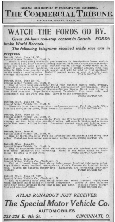 Following are copies of a series of telegrams sent by FMC to dealers branch managers across the country as the race progressed. In addition, several evening and early morning newspaper editions carried updates of the race throughout the morning and afternoon of June 22. Initially, Henry Ford dictated that the Ford six should begin with a 40 mile per hour pace through the early morning dark hours. As the sun appeared (some reports read that first light came between 2 and 3 a.m. on this, the longest day and shortest night). The Ford six was initially in fourth place, behind the 50 hp Pope, Thomas Flyer and American Underslung. However, during the night, the American dropped out, and Kulick, driving the Ford, began to increase speed and gain on the other two leaders, the Thomas and Pope. The telegrams below were converted into an ad by the Cincinnati dealer: