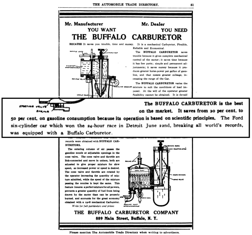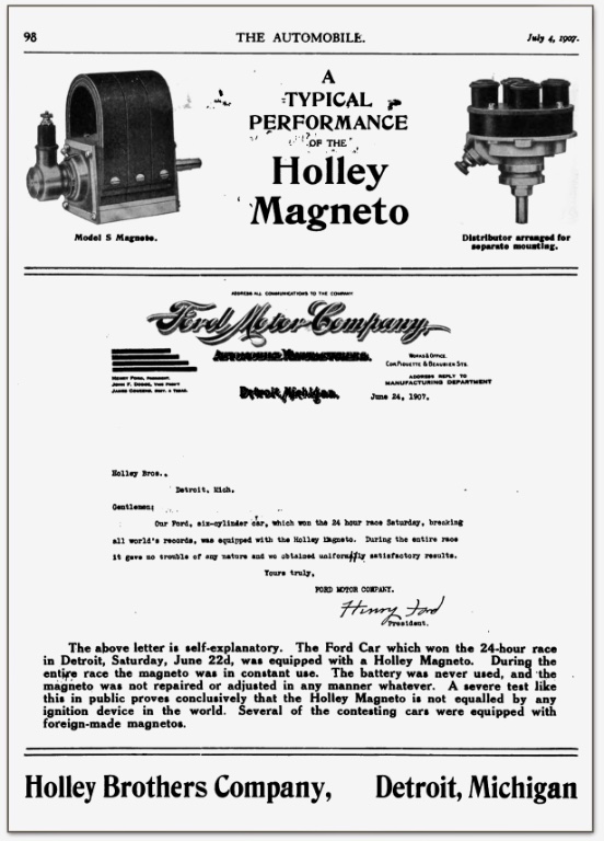 Even today, the Holley Foundation recognizes the magneto used by the Ford Model K in the 24 hour race held at Detroit. Unfortunately, the website doesn't mention the brand and model of car: