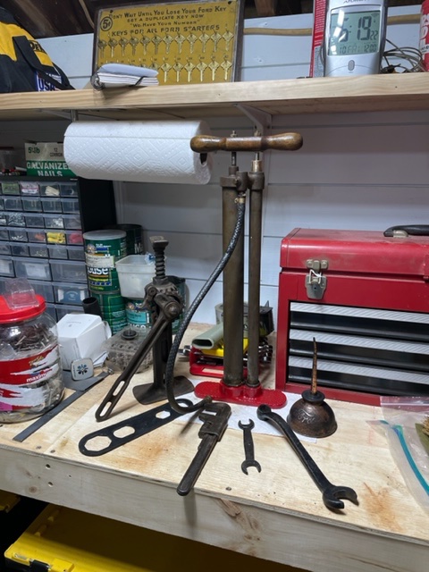 The pliers are soaking and a proper square shank screwdriver is on its way to me. I KNOW the Aeolus double barrel has a black rubber sheath over the cloth covered rubber hose, and others will say it’s suppose to be just plain red rubber. My pump, my choice, it has era proper end and brass fittings if you look close and it came to me that way 😉
