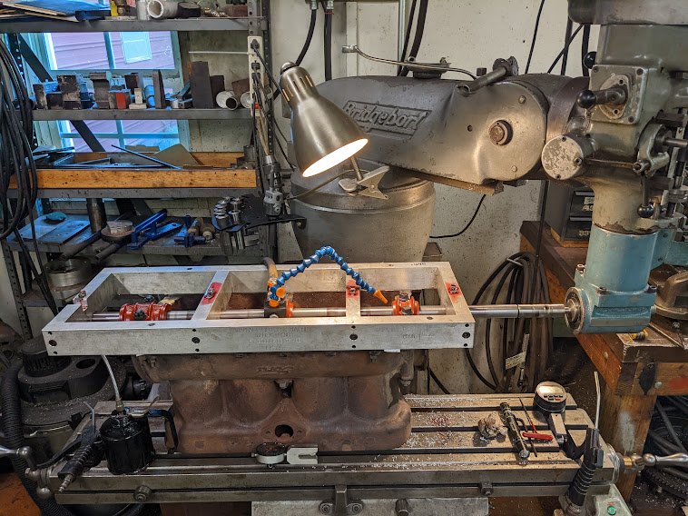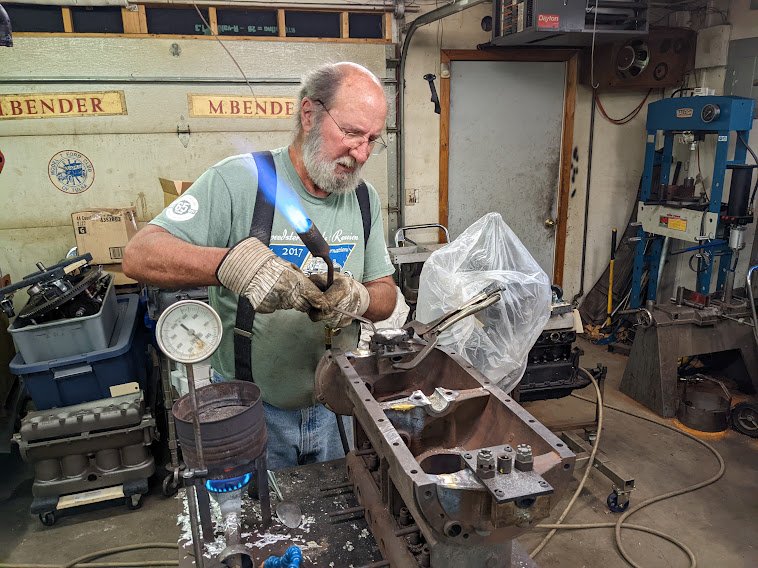 It was fun and educational watching him pour the babbitt and line bore it to provide the proper clearance to my crankshaft. He also machined it to allow the proper thrust clearance for the crankshaft, as well as put in and reamed a new camshaft bushing. He even let me pick out a better cam from his bone pile. To top it off, the oil pan went onto his straightening jig for a small amount of tweaking to get it trued up.