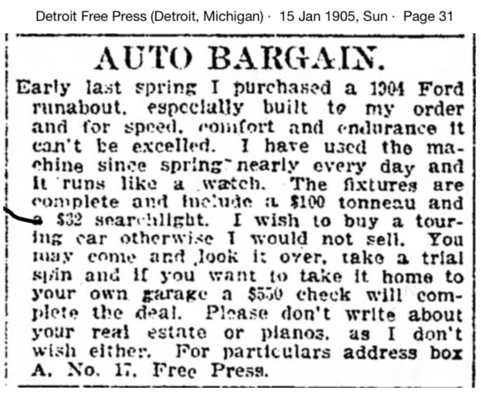I was looking for a few early Ford ads and articles in Newspapers.com, and came across this. A Ford Model A, with options, for sale in Detroit, January 15, 1905: