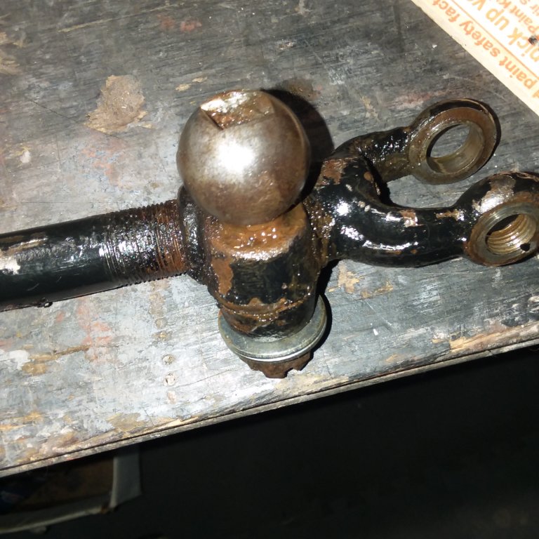 Dan, your tie rod end looks to be considerably worn where it rests on top of the steering arm. This will allow it to rattle up and down in service. When I rebuild a front end, I dress the eyes on the end so they are flat. This will open up the gap between them, and you don't want to close that gap by crushing the yokes together. Instead, I use a worn spindle bush to make new tie rod bushes. They are the correct OD, and I open the ID to suit the pins. The flange on the bush is then worked down to closely fit between the end yokes. The bush is then fitted with the flange on the top of the spindle arm, where it makes a wear surface for the weight of the tie rod, at the same time taking out all the rattle.