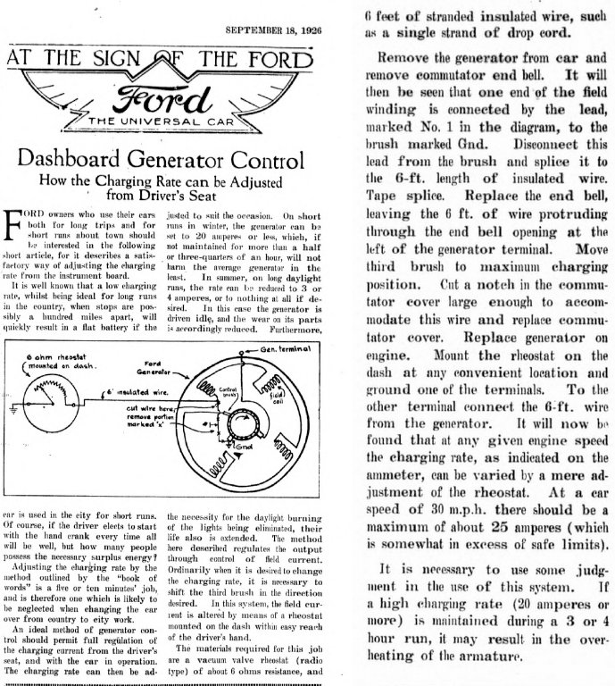 If I set my '27 generator with stock cutout rate high enough to hold the ammeter at zero to 1 amp charge at road speed with the lights on, it shows about 7 amps charge with the lights off. If I turn the lights on with the engine stopped the ammeter shows about 7 amps discharge, which seems too high to me, so I question the ammeter accuracy. It is accurate at O. Question: If I add a switch to allow inserting a resistor, such as one or more ignition resistors, into the wire between the cutout and the battery to reduce the battery charge rate at road speed with a charged battery and with the lights off, will that allow the generator to damage itself? Is there a maximum recommended voltage, measured at the generator output terminal with the engine running at road speed? I'd think anything up to 8 volts would be OK. I'd like to limit the charge rate with a charged battery and lights off to about 1 amp. PS: The engine runs MUCH better on BAT with the higher charge rate than it did with a lower rate or no generator, but I normally run on MAG.