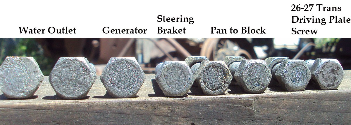 Cap screw heads that is. The trouble with cleaning parts hour after hour is that my mind wanders to the land of Oz, Kalamity Dick and questions about how the parts were made and when. Many of the Ford bolts in this batch appear to be from one car and have a round depression in the middle of the head. I have other original Ford bolts without that depression and a few that do. While this may not be an important detail to most, I still wonder what era or plant these might be from. Was the depression part of forming the head of the bolt? Have others noticed bolts like this or know what era they were used?