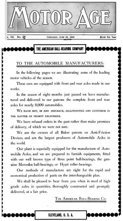First, both the front and rear axles have "Ford" written all over them. The first Ford model to use drop forged I beam construction front axles, the "B" is also the first enclosed drive Ford with Henry Fords own three point design. Ford Motor Co. contracted with American Ball Bearing Co., initially for 250 Model B axles (Board of Directors minutes, April 4, 1904 and November 15, 1904). These were based on Ford patented differentials, and will be used for decades on Ford cars going forward. I was curious why a Cleveland company was selected to build the Model B differential, and found that American Ball Bearing was a well known front and rear axle builder by this time. Below is advertising for some of their work for Ford and other auto makers is indicated in this June 1905 multi-page advertisement in "Motor Age" magazine: