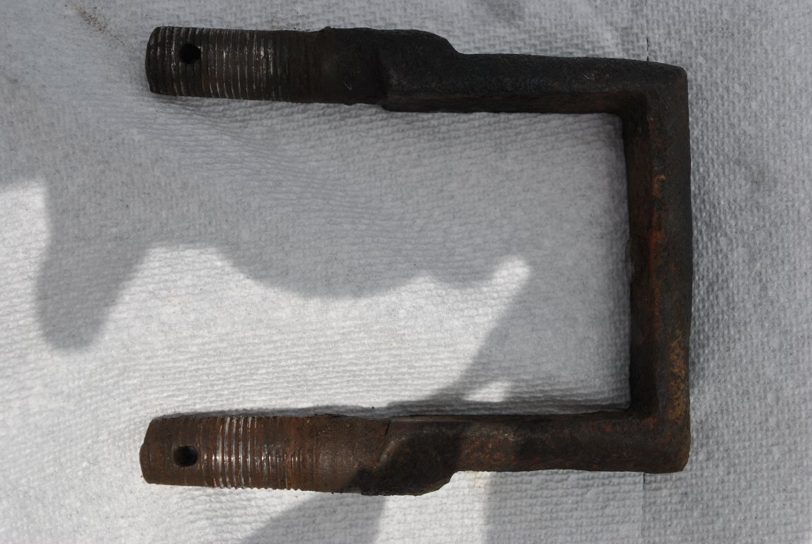 This is as Steve from Lang's pointed out is a REAR spring clamp, It was mounted on the front spring along with another just like it. Notice that the threads are completely stripped. When I removed the cotter pin the nut turned 1/4 turn and fell about 1/2 inch, then just wiggling the nut brought it the rest of the way off. Glad I didn't drive it far before deciding it needed work.