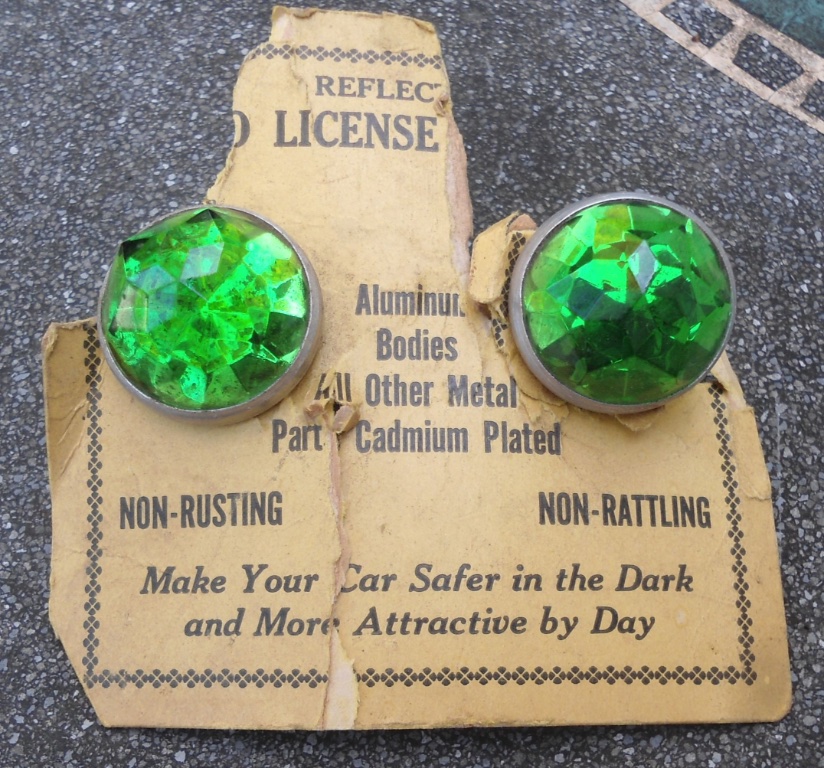 Those appear to be accessory license plate fasteners. They probably were once reflective. Polishing the aged plastic might restore them. Similar items can be bought today.