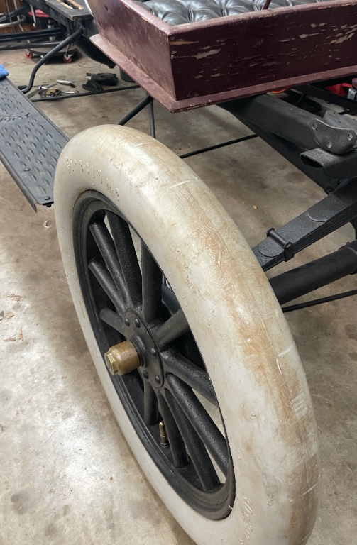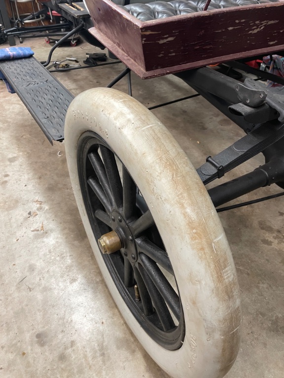 With the older tubes I used, I just filled the tubes with clean Flagstaff air from my compressor, and the tires have stayed the grey color since they were mounted. I'm not sure how the mileage for these tires would be since my cars with the grey tires are "show cars", but Bruce Borledon drove his 1914 runabout that has the grey blem tires on the MTFCI Tour in Hamilton, and he seemed to have no problems. Russ Furstnow