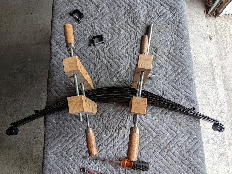Anyway, if a rear leaf spring assembly job is in your future, I would suggest using this approach to compress the rear spring. The same approach could be used on the front spring assembly, but it is pretty easy to compress that two wood clamps work fine. I found on my front spring that I had to flip one of the leafs to get them to nest better. You can see that the second to largest leaf is not fully riding on the bottom leaf at the left side of the spring in the front spring assembly picture below. That is the one that I flipped around and then they all nested like they are supposed to when it was compressed all the way.