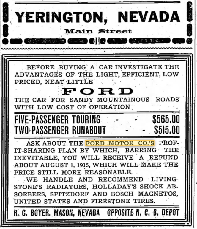 It might have come from a dealer specializing in desert work, like RC Boyer in Mason Nevada, on the Nevada Copper Belt railroad line. He advertised his Fords as "the car for sandy mountainous roads." His supply of cars probably came from the Calavada Motor Co. in Reno, which got cars from the San Francisco assembly plant.