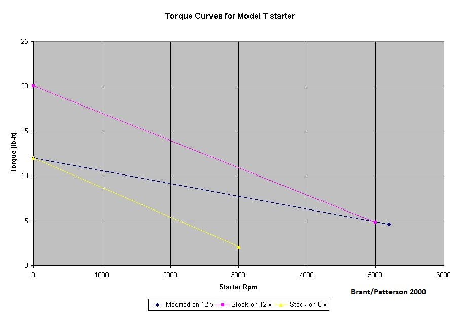 I have been running a converted starter for many years and am quite happy with it. I bought a car that had been changed to 12V with an early 60's Ford Falcon generator and regulator and also had some 12V accessories. Rather than change everything back to 6V, I rewired the starter to slow it down and lessen the "hit" that it delivered to the flywheel. As Ron's chart shows (I think,) it still hits the flywheel harder than a 6V, but not nearly as hard as a 12V, and turns faster than a 6V. Anyway, it sounds more like a 6V but turns a little faster, and is easier on the starter, bendix, and flywheel. MHO.