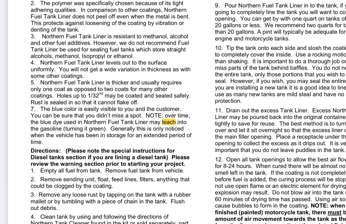 If the gas tank was lined several years ago, any bleeding at this point is very unlikely. Gas tank lining typically fails by peeling or flaking. This can cause clogged fuel lines and screens. it isn't likley to damage the engine. Lining that is installed in a properly prepared tank usally does a good job.