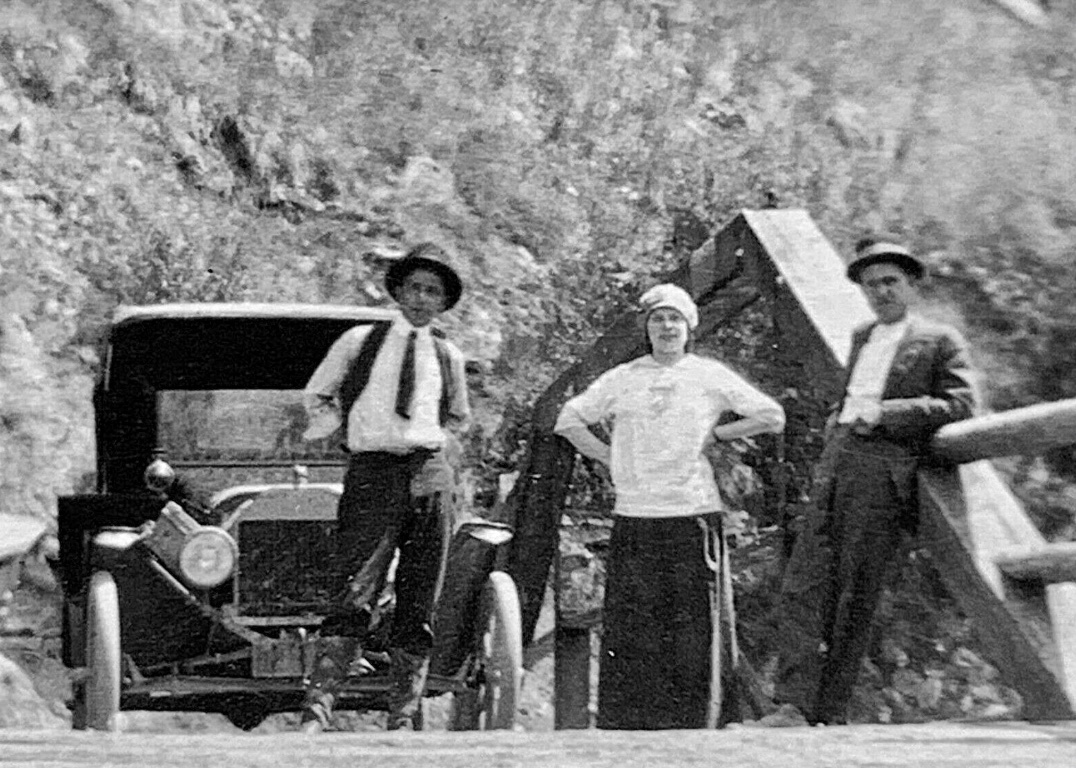 The T appears to be 1917 or earlier based upon the top's rear curtain. It has aftermarket Firestone type demountable wheels with spare carrier, and oil tail lamp. I couldn't say for sure, but it may have a 1915/'16 flat curve rear fender? The burn scars appear to be no more than a decade or two old. There are several areas in California that have redwoods. It could be any of them. But a high likelihood it was in the Santa Cruz mountains. And fairly likely in the Big Basin Redwoods State Park.