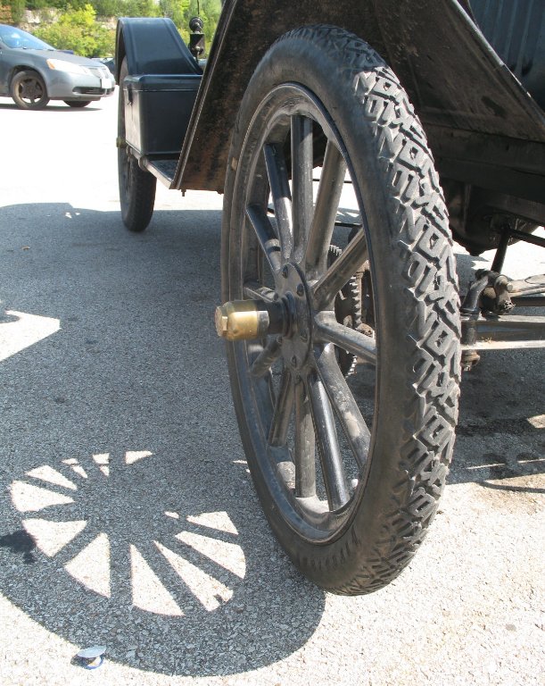 Meanwhile, that ancient checked tire haunted me. I figured it would survive on pavement, but the rocky Kansas back roads might eat it up. So I phoned Lucas Classic Tire in Long Beach and ordered a new 30 x 3 Wards Riverside to be shipped to George in Osage Beach.