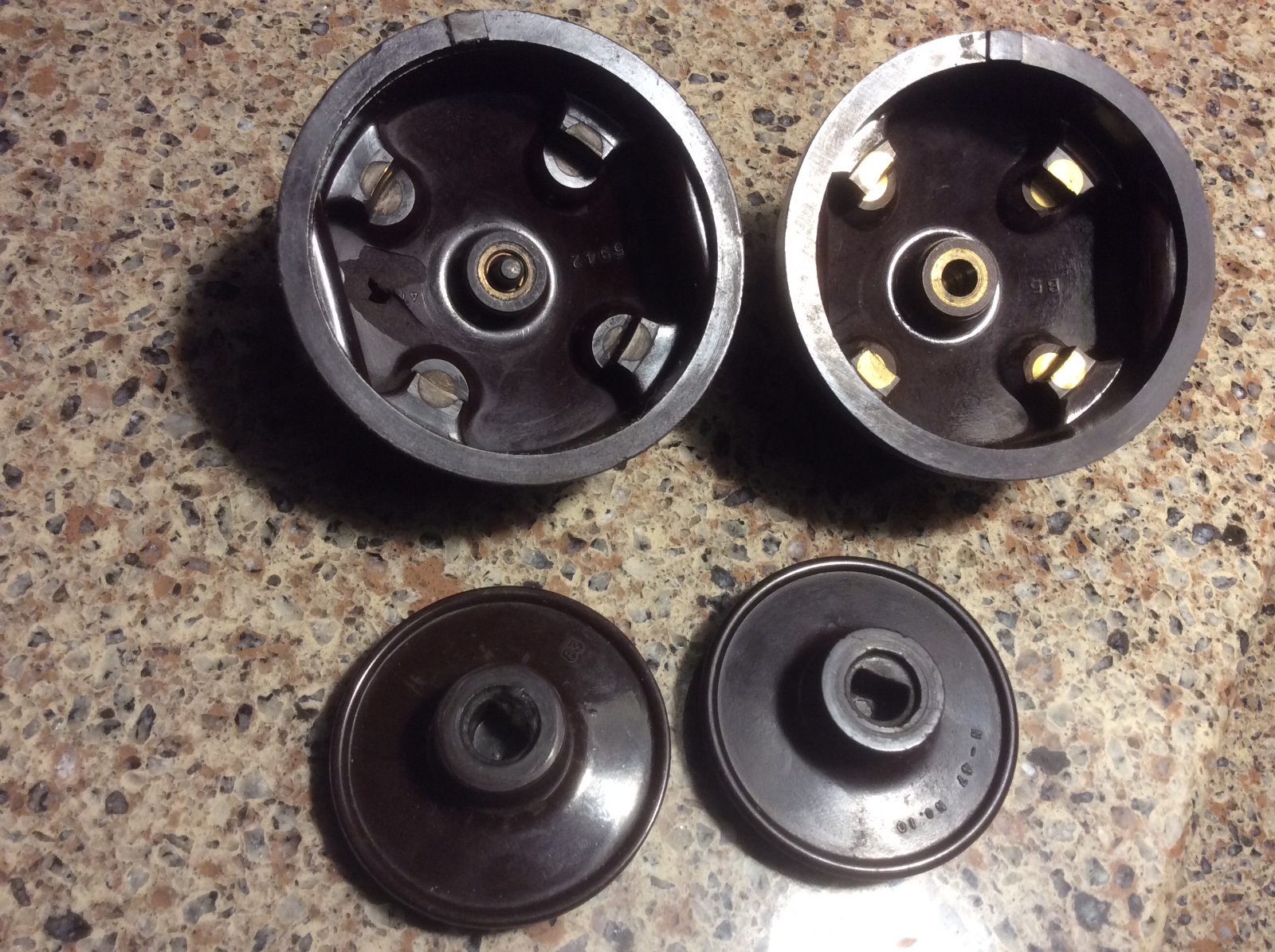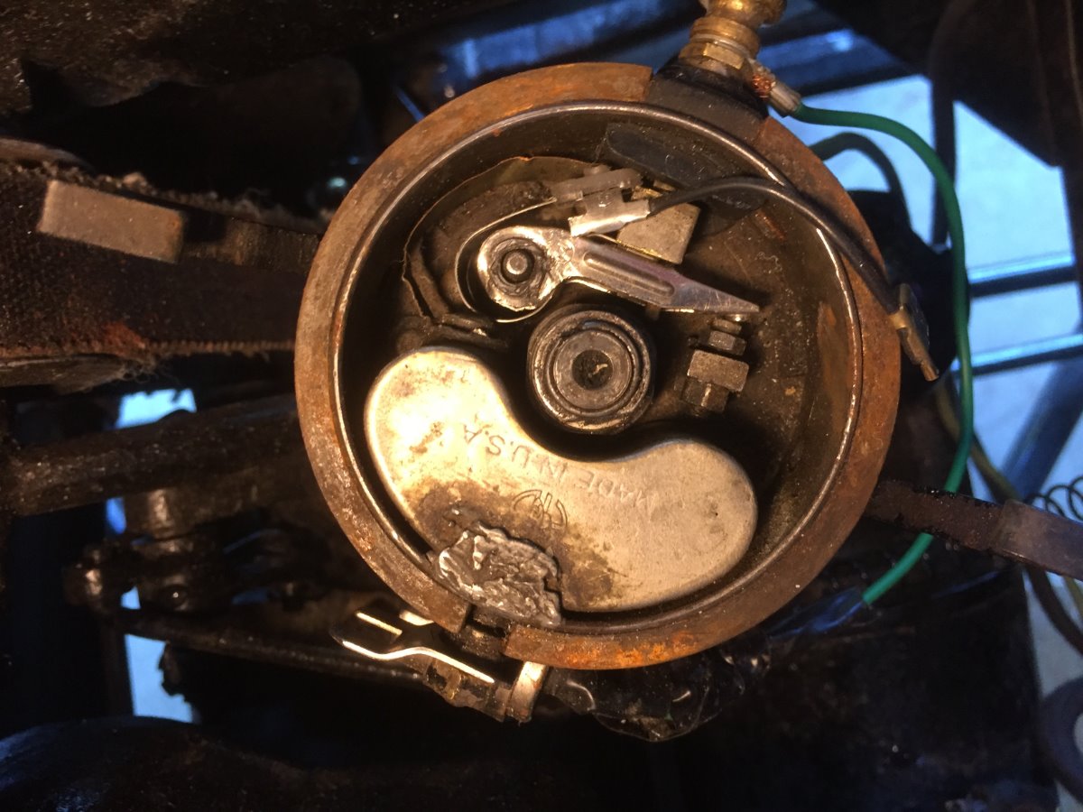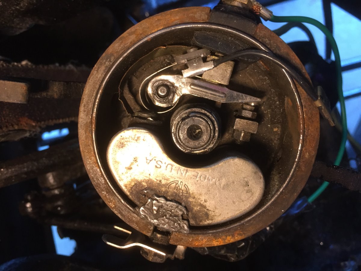 okay, I got a front plate rotor, and the hole is too small for mine. Attached is more pictures. I am almost ready to just order a new distributor assy from MACS. any advice? I am attaching maybe better picture top down. The points don't seem to be correct, looking down on the. I am confused, any assistance is appreciated. Thanks all, R/jim