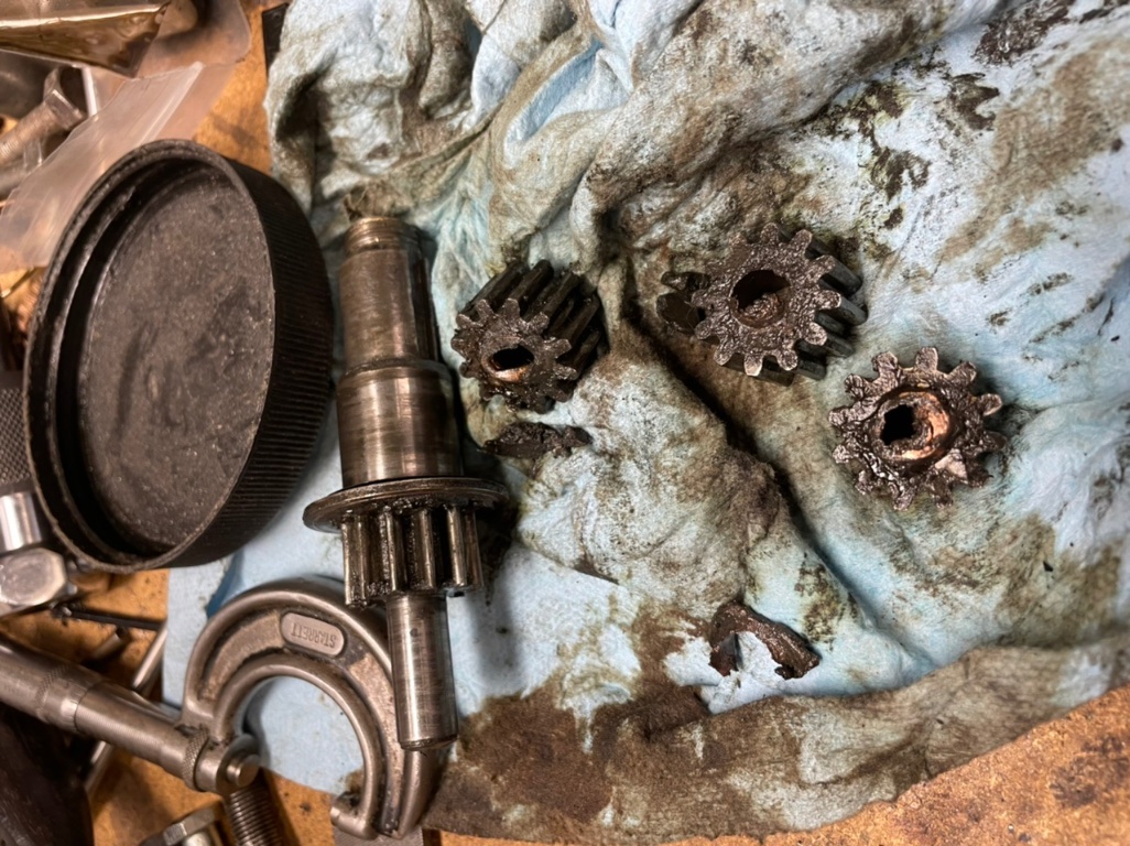 I got the shaft out, inspected everything, and found that triple gears were really loose on the pins. When I took them off, I found that they had been badly bushed using what looks like copper pipe(!?). This is odd since they don’t normally have bushings. The bushings fell out in pieces when I took the gears off. The shaft is good, other than some bumps caused by dents that were keeping the bushings from sliding on. I filed those off and polished the shaft bearing surface on the lathe and it’s good to go. The cover is good and the hole is not oversized. I ordered new pins, and a 4-1 gear set which should be a big improvement over what I had. Nice to have a $60 fix to the problem.