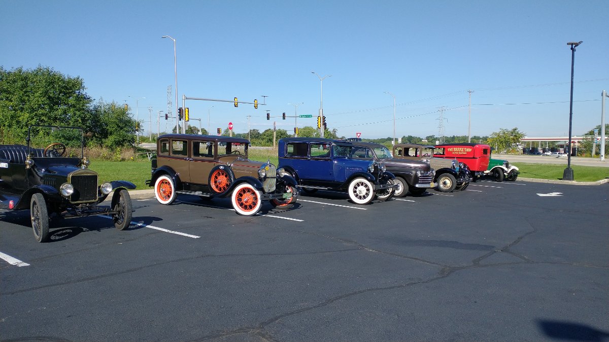 We start out at a McDonalds on the SW side of Milwaukee where we all meet for breakfast. This year I tried to take my Speedster. I recently added a new carburetor, a Wheeler Schebler that I purchased from Stan. It works, but it has some issues I am trying to work out. The car ran fine a couple days ago, but of course this AM, it failed to start. I was running out of time, so I put it back in the garage and got out the trusty Touring. 22 miles in 40 minutes. I do not know. That is cutting it pretty close. Thankfully the group did not start on time, and I made it before they all left. I was the only Model T and the rest were Model A's.
