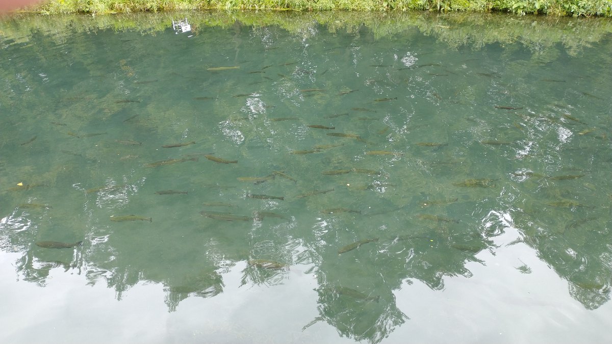 We arrived at the Rushing Waters Fishery and met our tour guide. He calls himself an Aquaculturist. Most of us would say he raises fish. This location is specifically for raising trout for sale to restaurants and grocery chains. They raise enough fish to supply about 7 states with high quality trout. I believe we saw over 14 ponds, and I do not know if we saw all of them on their 81 acres. The ponds are all about 50 degrees and fed from numerous springs in the area. Our guide informed us the water is clean enough to drink, but my guess is that if you dipped a glass in the water you would find a trout swimming in your glass. The trout are raised from eggs and grown until they are about 13 inches in length. This takes 13-14 months. The fish are transferred from pond to pond on a daily basis as they grow larger. They have a process for counting the size and number of fish in each pond.