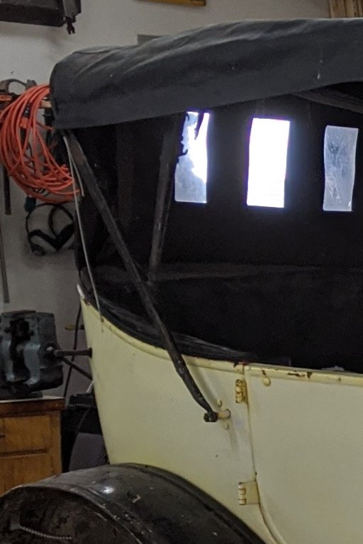 Your top does not look like a Ford Top. The 3 lites in the rear curtain are not typical of a '23 but more like a top from a low radiator car. The fastening of the top irons are also not typical of a Ford. The '26-'27 Fords had irons that fastened similar to yours, but not as low on the body. I think you have a top and irons from a different car that were adapted to fit your touring. Just a thought.