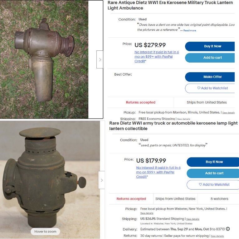 Though Dietz lanterns are still made(off-shore)- these look old and military (olive drab paint)to me. Most that I have seen and own are tinplate (rust resistance) with automotive cowl lamps being painted black. An exception was during WW2 when Dietz had to use terne plate and painted general purpose lanterns gray (I have just one) for rust resistance. My guess would be WW1 for ambulances and the relatively few trucks at the front - artillery and ammo was moved to the front at night by horses. I don’t know if airplanes flew at night, but there were were plenty of observation posts and observation balloons looking for targets - troops and field artillery dug-outs.