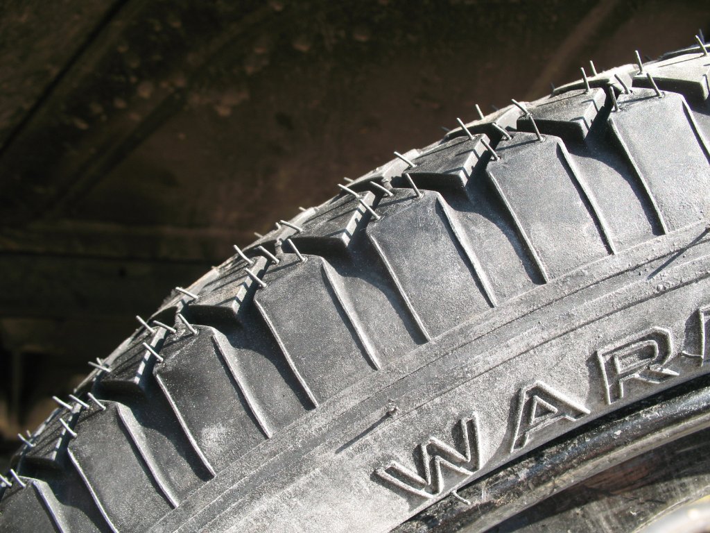 Meanwhile, that ancient checked tire haunted me. I figured it would survive on pavement, but the rocky Kansas back roads might eat it up. So I phoned Lucas Classic Tire in Long Beach and ordered a new 30 x 3 Wards Riverside to be shipped to George in Osage Beach.