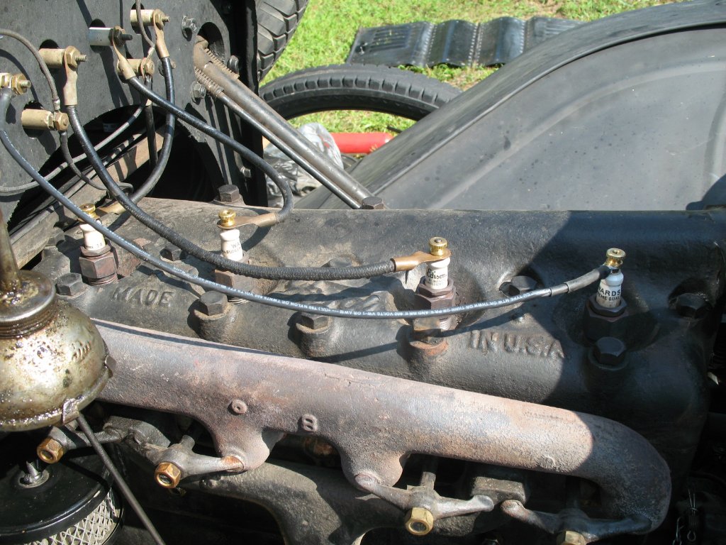 We greased and oiled all the cups and oilers, and I took the car for a test run. It fired on all four and took the hill to the main road in high gear. I was pleased. I finished repacking the trunk and I was ready to go. I set out at 1:00 PM, and as soon as I hit the main road the car was running on three cylinders again. I was not pleased. I stopped and administered the screwdriver test. It suggested trouble in #1, so I replaced that Wards plug with one of the new Autolites. OK, back on four cylinders I drove on. A few miles farther on, I was struggling up the hills on three cylinders again. I didn't bother with testing again. I just removed the remaining Wards plug and the two Edisons and installed the remaining new Autolites. The car ran normally on four cylinders the rest of the day and after.