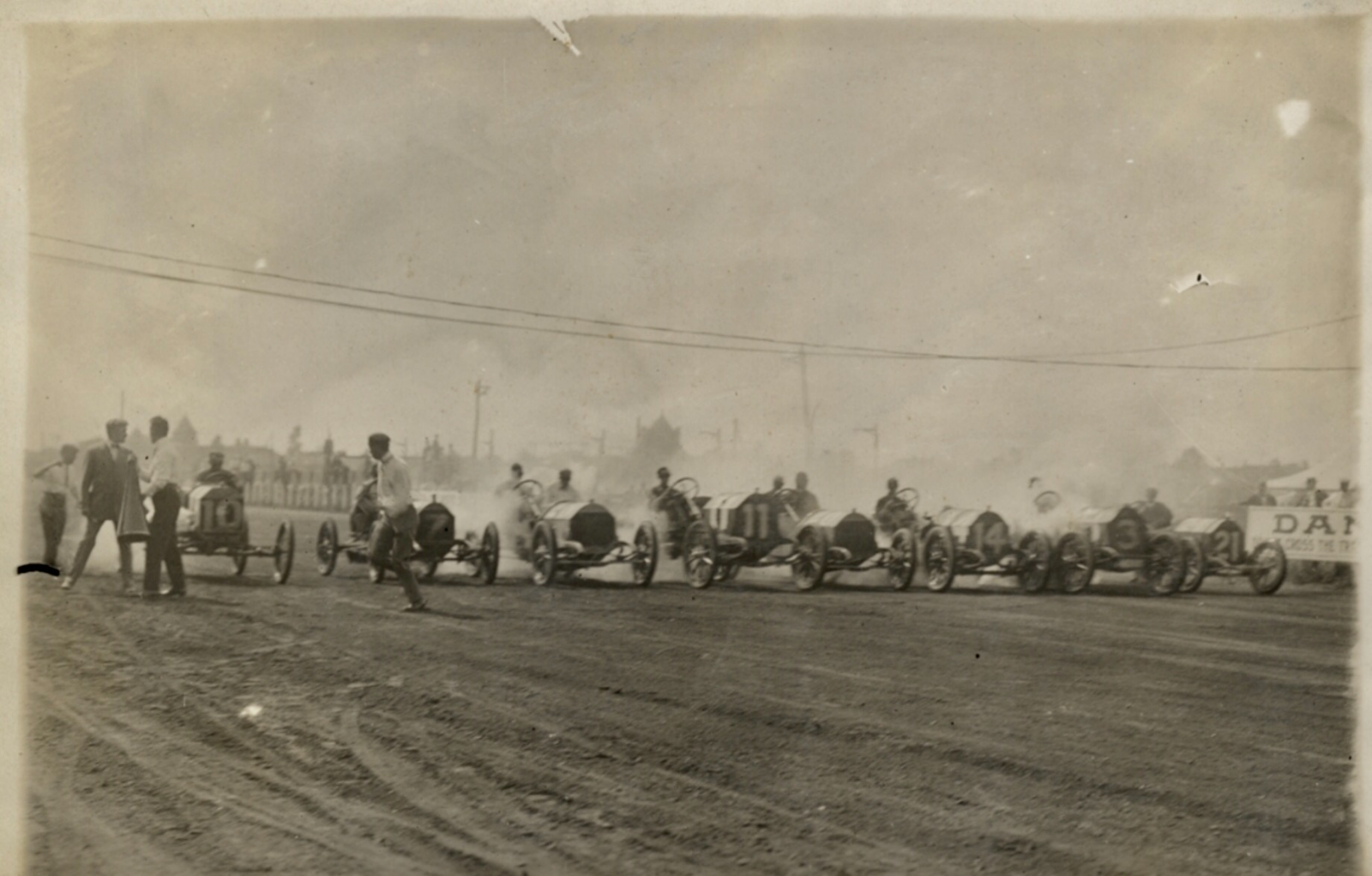 Eight cars lined up for the race. Frank Kulick and the Ford are on the outside (#10) to begin the ten mile race: