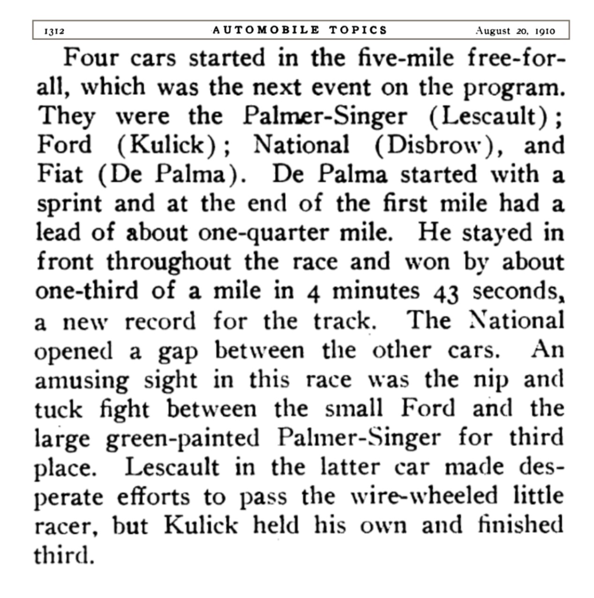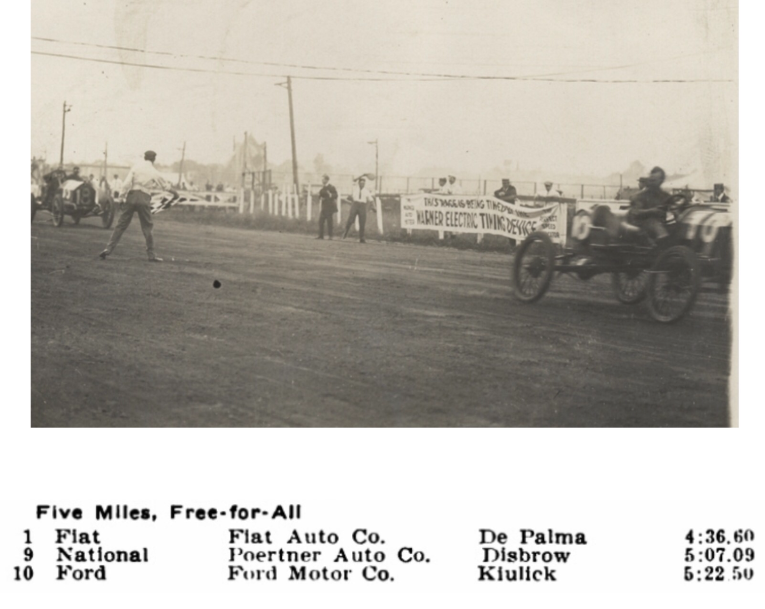 Four cars ran in the five mile free for all, a Fiat, National, Palmer-Singer and Ford.