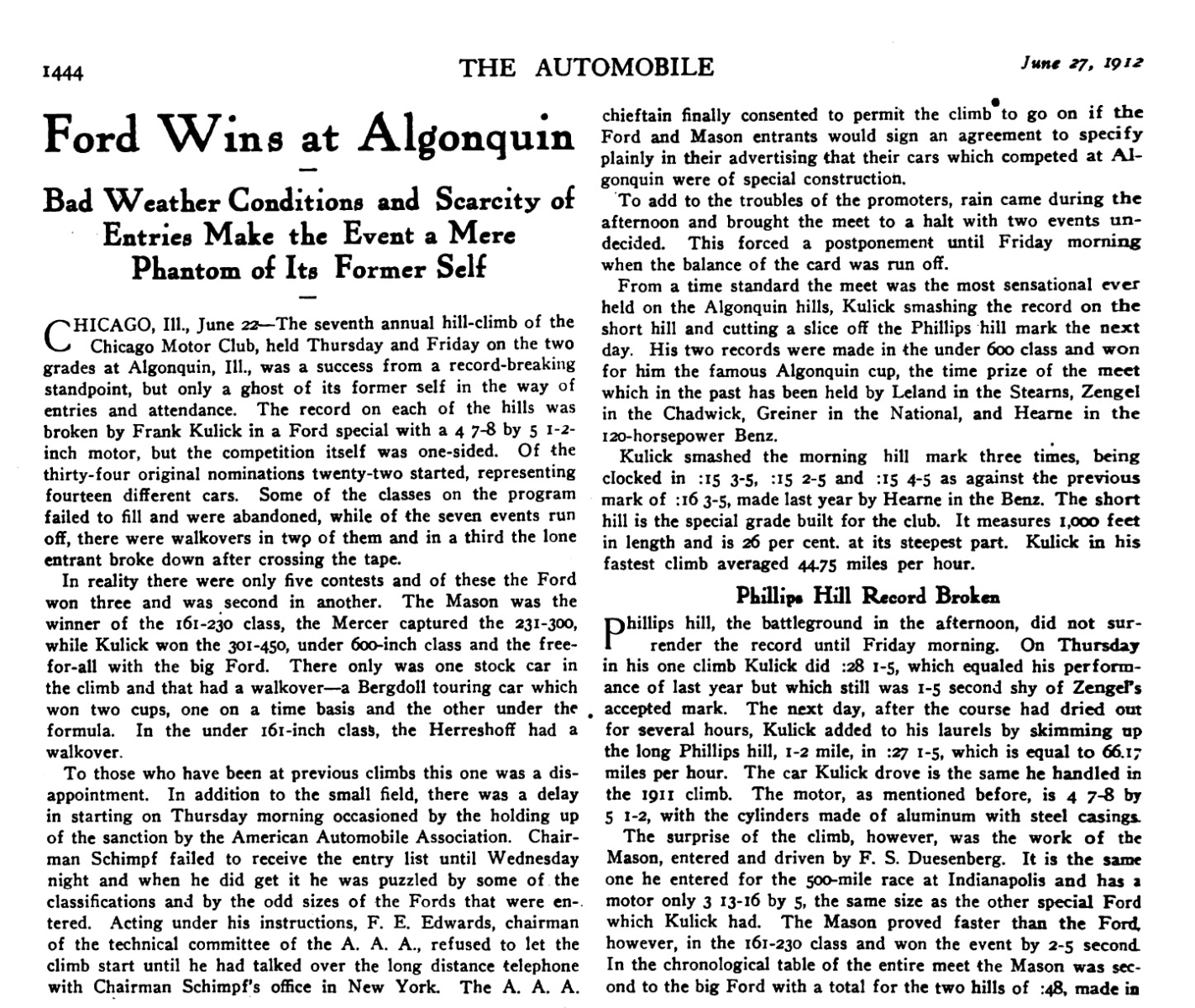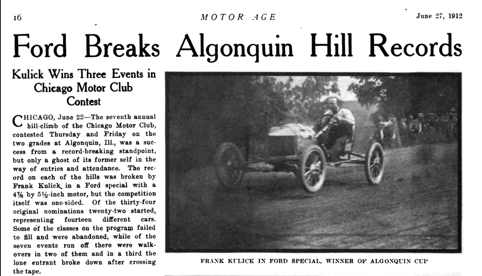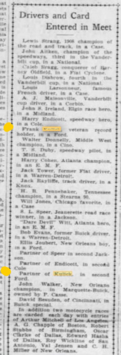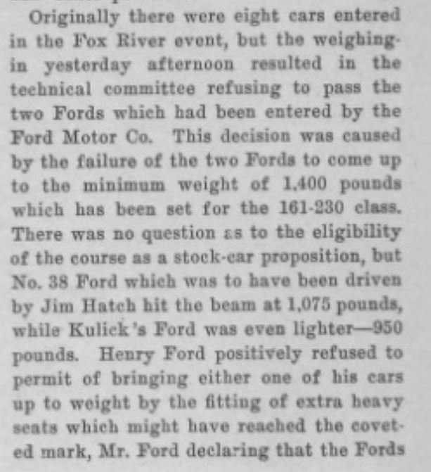 Sorry to hear about the hail. I had not noticed the last paragraph. I am still inclined to suspect Ford did not intent to send another driver, and none was referenced. Some pubs listed Kulick and partner, others such as the Ford Times only mentioned that Kulick was going with two cars. In other events where Kulick attended with multiple cars he drove both (or in the casse of the Michigan State Fairgrounds track in 1911) three different class racers.