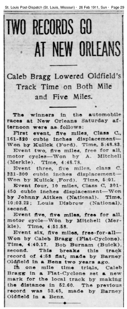 After looking through everything I can find, it appears to me that Ford intended to run one car against the largest fastest cars at New Orleans, without mention of the other Ford running in the lightweight (161-230) class. It does look like the Cases were all 284 cubic inches, or 121-300 cubic inch division.