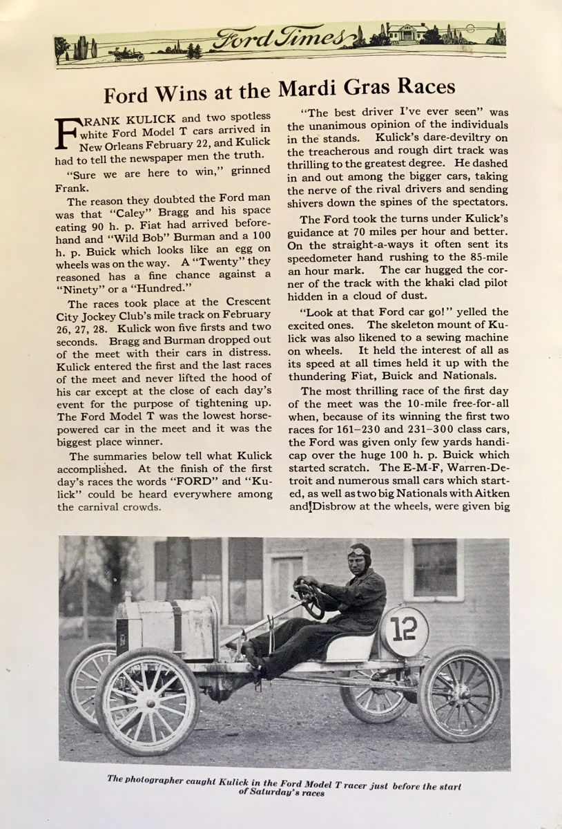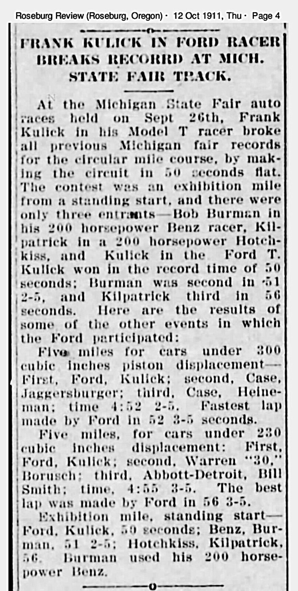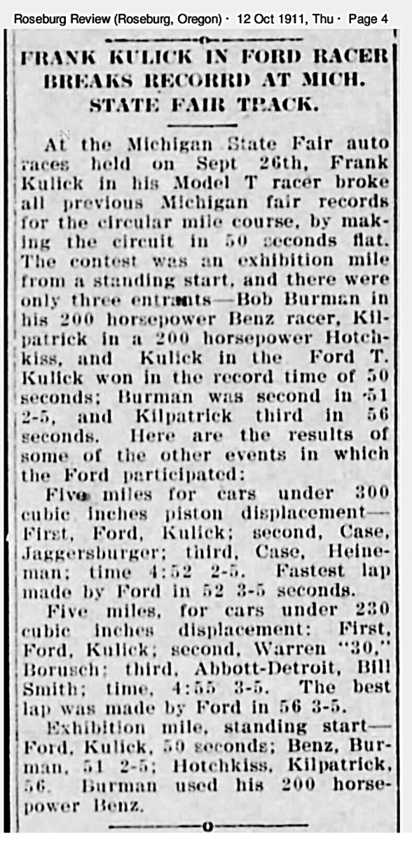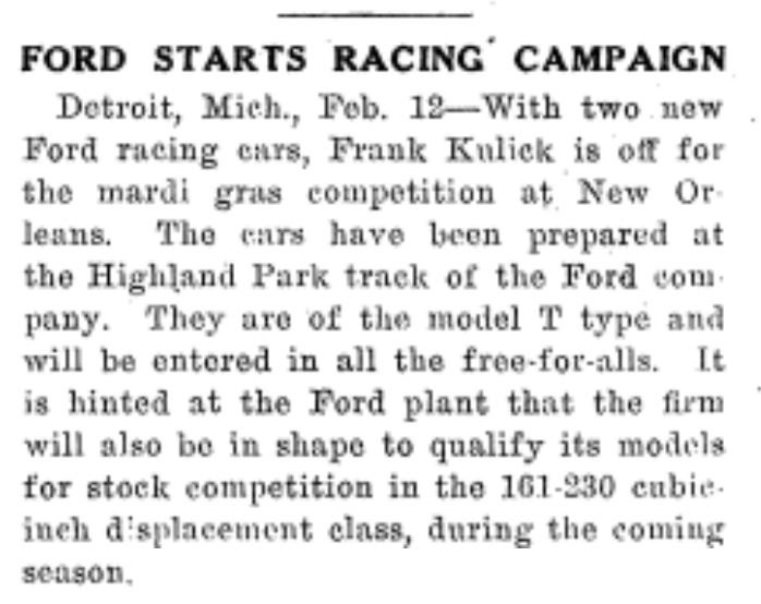 I believe this is one of the first Ford “Special” racers. Below is one of the stories about the race that appeared in newspapers and magazines around the country. It was one of Ford’s first speed contests since 1908 (not 1907, as most historians write, because Frank Kulick did track race a Model K in 1908):