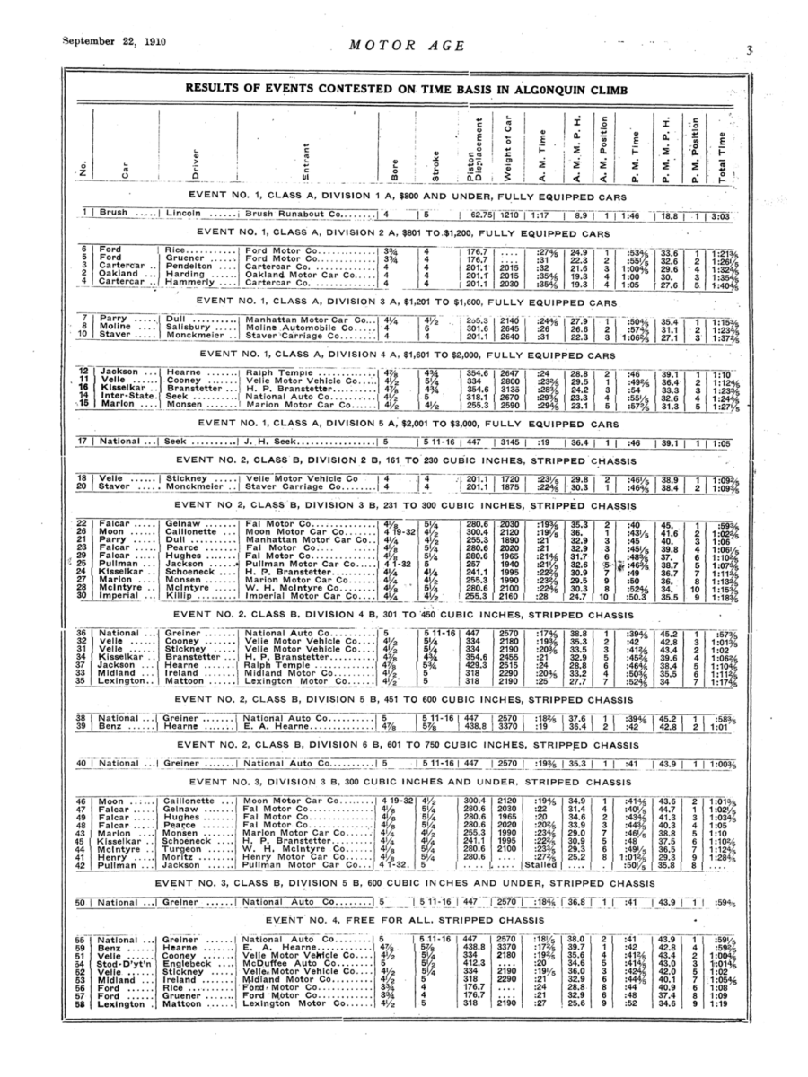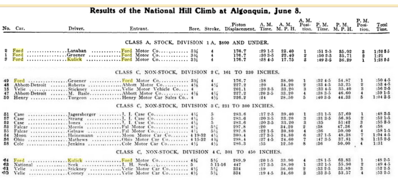 It seems Algonquin HC 1910 did not have non-stock Class C divisions. That would be a reason no Ford Specials (nor Frank Kulick) participated in the hill climb.